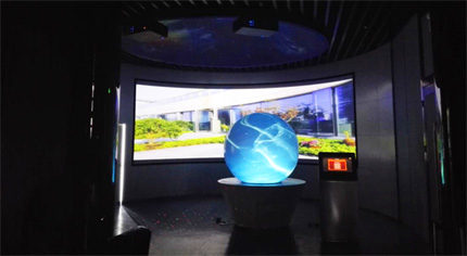 用戶端通過觸摸22寸觸控一體機為多媒體球幕投影,球幕以1.5米直徑模擬地球的形式精確定位到要查詢的地點...
