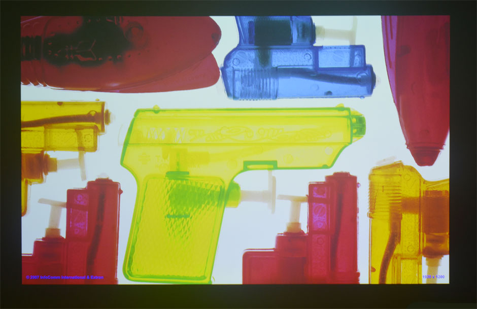 在商用領域,投射大幅圖片或播放宣傳視頻是經常要進行的項目,此次我們選取了汽車發動機、藍色熱氣球和彩色水槍三張高清圖片進行演示。從投影畫面中,我可以看到發動的機線路構造顯示清晰,線材顏色還原準確;藍色熱氣球圖案的色彩沖擊力令人難忘;彩色水槍圖片則將顏色展現得非常自然,逼真。從這三張靜態圖片中,可以感受到NP-CR5450HL在色溫適配、顏色匹配方面達到專業水準,并力求在最大程度上準確地還原圖像信息。