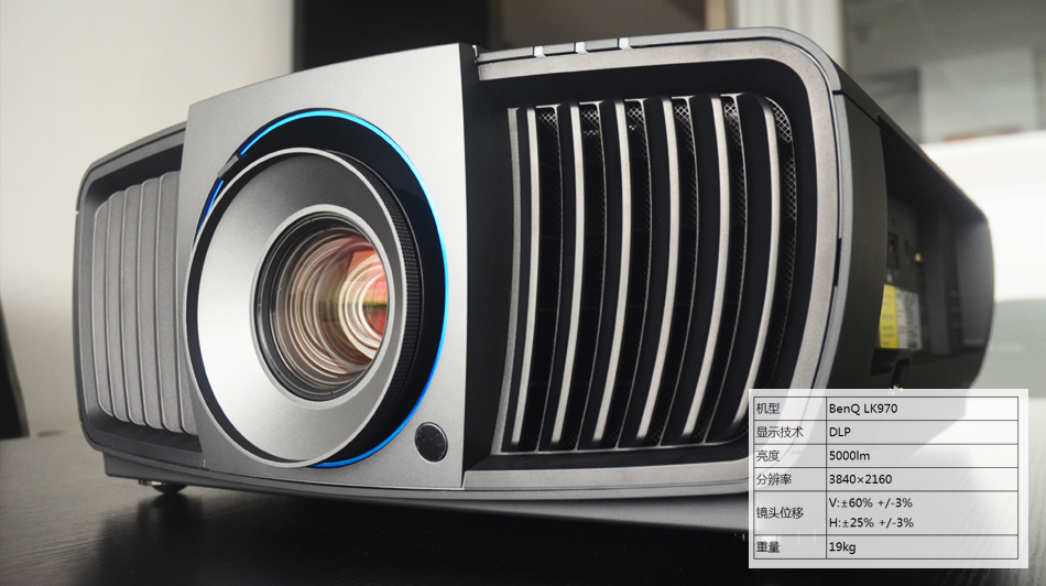 BenQ LK970 機身設計很具科技之感,鏡頭中置,一圈亮藍色細條是點睛之筆,兩側散熱口格擋很有視覺沖擊力,機身上的細膩紋理提升“顏值”,整體來看霸氣十足。