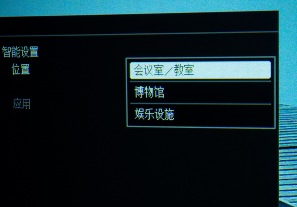 在菜單中的投影設置標簽中,進入“智能設置”,可以看到有三個場景選擇,用戶可以根據項目來自己選擇,我們選擇的是“會議室/教室”模式。