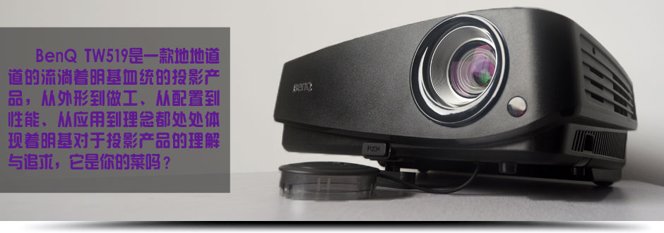 TW519是一款貼著濃重BenQ標(biāo)簽的投影產(chǎn)品,簡(jiǎn)單明了的外形設(shè)計(jì)、精致扎實(shí)的整體做工、主流通用的參數(shù)配置、鮮活明亮的顯示效果,無(wú)論從哪個(gè)方面,我們都能輕松的找到明基的影子。作為在商教演示領(lǐng)域市場(chǎng)上新的嘗試,BenQ