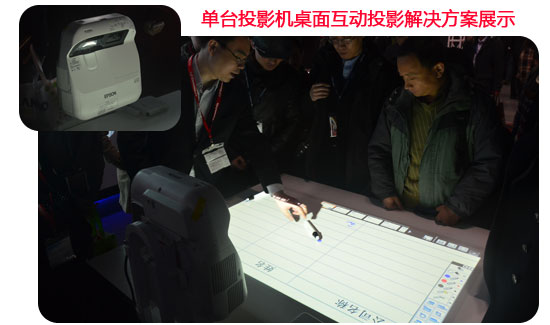 利用一臺超短焦發射式投影機正放在桌面進行畫面投影,讓桌面瞬間變成一臺具有互動性的智能桌面,不僅能投投射出亮麗清新的畫面,并且能夠通過互動功能搭建一個很好的交流的平臺,無論是互動進行內容講解或是進行桌面互動游戲,都有非常不錯的感官體驗,同時,通過隨機配備的觸控筆,參與人員能夠非常方便的對投影畫面進行操控與點擊。