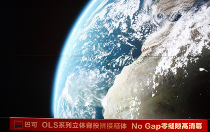 除了投影機,巴可此次在國內首次展示了全新“零縫隙”高清幕技術。目前該技術已全面應用在巴可OverView OL系列產品線上。在展會現場巴可搭建了一套4K立體背投拼接屏OLS,加上“零縫隙”高清幕,令這個應用極具噱頭。巴可大中華區產品市場副總監薛峰介紹到,4K立體箱體可以滿足特定領域中特殊需求,例如在偏遠地區的石油勘探,既可以顯示設備能夠24/7運行,同時又可做完成對遠程立體素材的傳輸和顯示,有個這套系統用戶便可一舉兩得。
