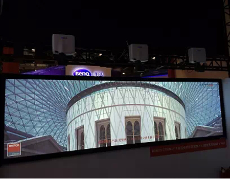 另外,通過采用三臺分辨率為2560×1600,亮度為5000ANSI流明的CTWQ-51B主動立體投影機,搭配0.28:1超短焦鏡頭以及哈克尼斯屏幕實現的6000×1600分辨率超清短距融合系統展示了巴可全新推出的CT系列投影機以及業界最短的0.28:1超短焦折射鏡頭。僅用距屏幕不到0.6米的空間就實現了普通投影機至少需要投射接近2米才能顯示的屏幕尺寸,而這還已經包括了機身的厚度。這就是CT系列投影機和0.28:1超短焦鏡頭所帶來的獨特性能。