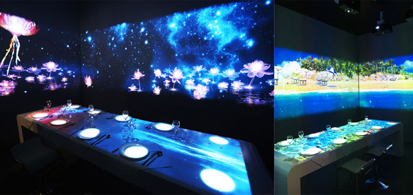 隨著高端工程投影機(jī)投入到更多細(xì)分領(lǐng)域,展會(huì)現(xiàn)場(chǎng),明基還應(yīng)用5臺(tái)工程投影機(jī),搭建了沉浸式多媒體餐廳解決方案演示區(qū),四周墻面及餐桌上投影美輪美奐的畫面,通過(guò)營(yíng)造不斷變化的場(chǎng)景氛圍帶給顧客沉浸式體驗(yàn),邊用餐邊享受視覺藝術(shù)盛宴。美食、科技和藝術(shù)結(jié)合的方式,盡顯高端奢華品味,大大提升了餐廳形象。