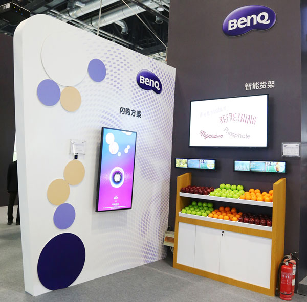 而現(xiàn)場(chǎng)展示的智能貨架方案,則是搭配明基專業(yè)貨架顯示器進(jìn)行超市產(chǎn)品推介宣傳的一種方案。其特有的顯示尺寸及比例更加貼合超市貨架的大小,使其與貨架完美切融為一體。另外搭配明基專業(yè)信息發(fā)布系統(tǒng),可以通過(guò)網(wǎng)絡(luò)遠(yuǎn)程將產(chǎn)品宣傳視頻、圖片、廣告信息等內(nèi)容推送到顯示終端,做到遠(yuǎn)程部署及中央控管。同時(shí),明基還展示了閃購(gòu)方案,它是一款通過(guò)品牌甄選促銷產(chǎn)品在店鋪內(nèi)進(jìn)行短期促銷,如節(jié)日、限時(shí)等機(jī)會(huì),以手機(jī)操作大屏幕上顯示的促銷產(chǎn)品,來(lái)獲得折扣、甚至免費(fèi)線上購(gòu)買產(chǎn)品,從而增加客戶促銷體驗(yàn)感的智能產(chǎn)品。