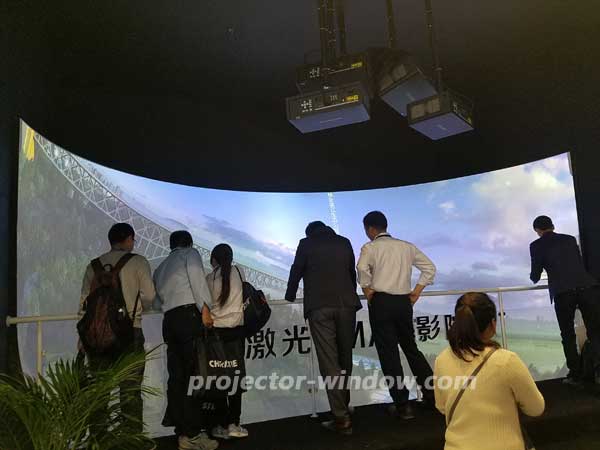 UMAX沉浸式激光影院,是通過多臺激光投影拼接融合形成一個U形的具有超寬觀看角度的大屏畫面。選用了三臺視美樂激光投影機通過特制融合電腦進行球面融合,形成一個直徑為5米的1/4球形畫面。其獨特的異形影像、極富沉浸感的空間,充分體現了投影顯示的靈活性以及激光顯示的高清高亮,色彩表現絕佳的優勢。