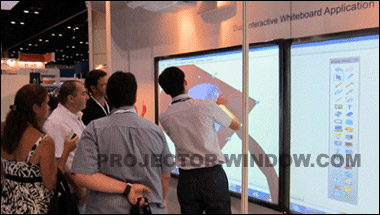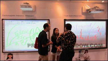 印天科技在2011 INFOCOMM美國奧蘭多展會共展出印天最新產品雙筆紅外交互式電子白板,該技術是印天經過半年多不斷地研發攻克率先在行業內研發出來的新品,印天的雙筆紅外書寫非常流暢,產品的穩定和品質得到了美洲客戶的一致好評。除此之外印天海展出了雙軌交互式電子白板D82、65寸液晶觸摸一體機(含PC)、電磁交互式電子白板,其中雙軌交互電子白板打破傳統的一對一模式,是將兩臺投影機分別投射的兩塊交互式電子白板連接在同一臺電腦上,通過VGA矩陣切換器以及專用的合成驅動軟件,可以分別操控兩臺電子白板上不同顯示內容,實現教學互動的最大化。雙軌展示彌補了傳統的以問為答為主,缺乏互動的教學過程,