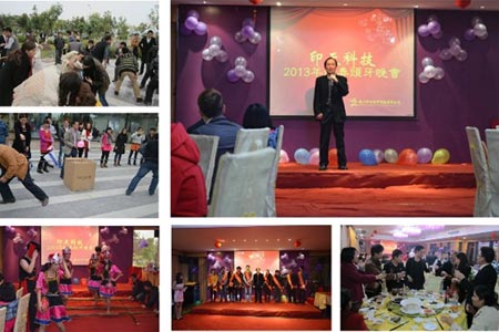 2013年2月22日,印天科技2013頭牙晚會在廈門環島路觀音山漁夫碼頭海鮮舫隆重舉辦。公司全體員工參加了此次晚會。本次晚會由互動游戲、員工節目表演、幸運抽獎、表彰先進、晚宴五個部分組成,現場氣氛活躍;佑螒颦h節,背靠背運氣球、銜紙杯傳水、踩氣球、雙人拔河、猜燈謎等游戲,全體員工積極參與,把印天人的朝氣、熱情盡情揮灑,為晚會做足了熱身。