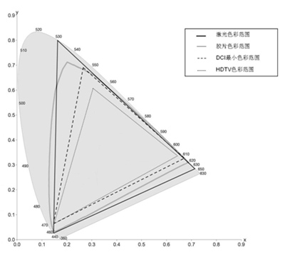 激光光源由于使用純度非常高的紅、綠、藍三原色光源,能實現遠遠大于傳統NTSC或DCI最小色彩范圍的色彩空間,能展現大部分人眼可以識別的色彩。而無論采取哪種白場色度標準,對于紅、綠、藍三原色可以分別精確控制的激光光源很容易實現.而目前大多數投影機使用的氙燈光源就需要通過濾色器來控制,不僅降低了光源的光利用效率,而且對色度不容易做到靈活的調整控制管理。
