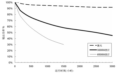 而采用激光光源的投影機使用的激光器壽命要遠遠長于氙燈,其理論壽命在2萬小時以上,固體激光器可達5萬小時。目前應用于激光投影光源的紅、綠、藍固態激光器質保時間在2萬小時以上。而且在激光領域,描述激光器壽命用功率輸出達標稱的80%來測算,即降低到標稱輸出的80%就認為達到壽命,也遠高于描述燈泡所用的半衰期壽命規格,在整個質保時間范圍內衰減幅度也遠遠低于燈泡光源。