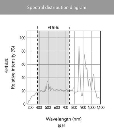 從氙燈光源的光譜特性上可以看到,可見光能量大約只能占到氙燈輸出總光能量的1/3–1/2,即氙燈光源光能利用效率最高也只有30-50%。
