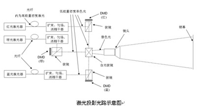激光投影機的光源,采用紅、綠、藍三種可見光激光,經過專門的擴束整形設備后,將激光發散角擴大,使其具有與氙燈光源相近的能量密度,而不再是能量密度高出氙燈光數萬倍的激光,此時的低能量秘密度單色光已經不具有剛從激光器出來時的危險性,也就是說從激光投影機鏡頭投出的光與從任何普通燈泡光源投影機鏡頭投射出的光具有同樣的安全性能指標。