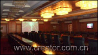 在其會議廳中,中控配合電源控制器來控制其廳內的燈光、投影機電源的延時、投影幕升降及其他設備的電源。配合CREATOR快捷調光機來控制廳內四路燈光的明暗,CREATOR快捷音量控制器控制廳內的背景音樂,使廳內充滿了的現代化高科技氣息。