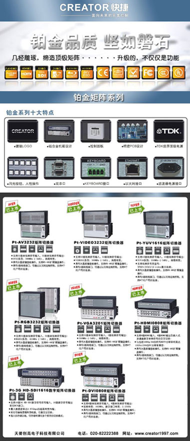 CREATOR快捷鉑金矩陣系列新品的推出標(biāo)志著CREATOR快捷在矩陣控制領(lǐng)域又實(shí)現(xiàn)了重大的突破,在這一領(lǐng)域繼續(xù)持續(xù)領(lǐng)先,為其在激烈的市場(chǎng)競(jìng)爭(zhēng)中進(jìn)一步擴(kuò)大市場(chǎng)奠定了基礎(chǔ)。