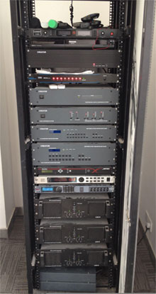 該會議室由投影機(jī)顯示系統(tǒng)、多媒體音視頻信號源、音響和中央集成控制幾大部分組成。主要包括PGMII可編程控制系統(tǒng),VGA矩陣,8路電源控制器,CR-V1011高球攝像機(jī),無線彩色觸屏ST-7600C,無線接收器CR-RFA等設(shè)備。選取具備先進(jìn)功能的DVD、攝像機(jī)和大屏幕投影機(jī),配備了一套CREATOR中央集成控制設(shè)備,控制室內(nèi)所有影音設(shè)備、信號切換、燈光、音量調(diào)節(jié)等等功能,不需要專業(yè)知識就能使用全部產(chǎn)品,不僅有效提升了工作效率和簡化復(fù)雜的操作,節(jié)省了大量的人力和財力資源。