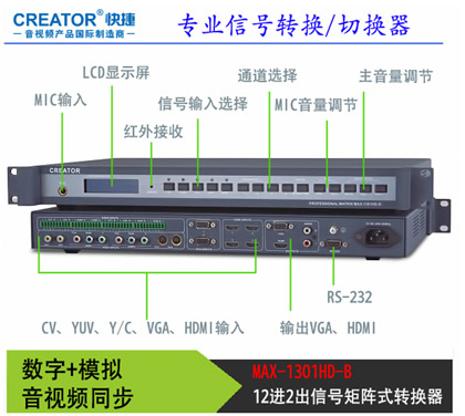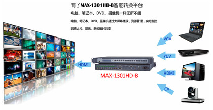 MAX-1301HD-B是一款集視頻信號格式轉換(SCALER)與切換為一體的矩陣切換器。支持將多種不同格式的視頻信號源:復合視頻信號(CV),分量視頻信號(Pr/Cr、Pb/Cb、Y),S-Video(Y/C)