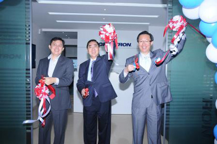 剪彩儀式象征著班加羅爾辦事處正式開(kāi)幕:(由左至右)快思聰亞洲區(qū)域銷售總監(jiān)林振明先生、快思聰亞洲董事行政總監(jiān)梁子球先生、快思聰亞洲董事楊其輝先生