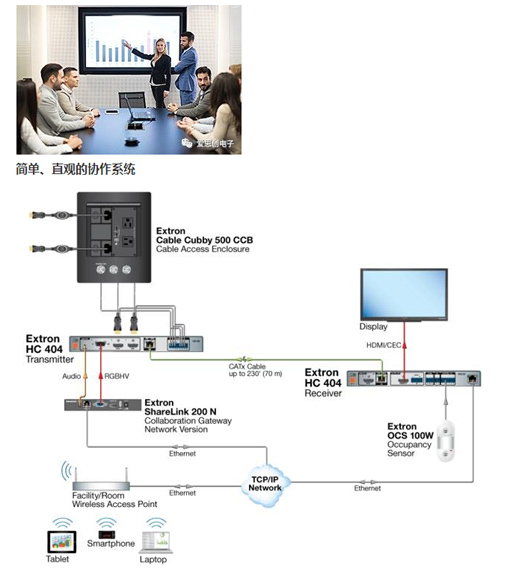 網關的無線協作式系統,可大大簡化用戶操作,甚至進一步添加 ExtronShow Me 線纜。通過