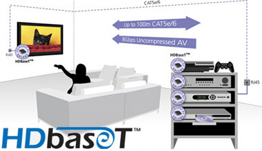 由韓國LG,三星,索尼電影娛樂公司和瓦倫斯半導體共同開發的HDBaseT新增的網絡功能還允許電視機等設備輸出視頻,第一個HDBaseT設備有望在今年年底面世,不過真正開始鋪開可能要等到2011年。HDbaseT支持最高20Gbps的傳輸速率,能更好的支持未來的3D和2K×4K視頻格式,傳輸采用普通的CAT5e/6網絡線纜,連接器也采用普通的