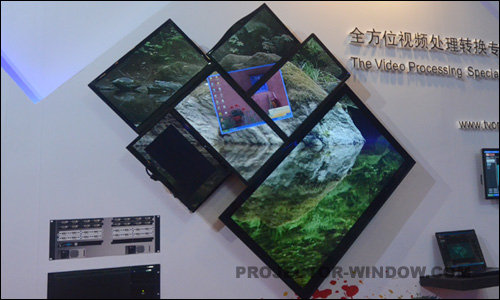 曹經理特別指出,本次展會的重點產品是C3-540,是TV One公司今年推出的新品,并就這款產品的技術亮點做了詳細講解。TV One最新產品C3-540帶3G-SDI/DVI-U接口組合的混合矩陣器/轉換器成為本次展會的亮點,F場六個不同尺寸的屏幕拼接,打造的創意顯示方案,并有兩個小窗口畫面顯示,畫面色彩出色,拼接畫面連貫,適用各種創意顯示應用領域。C3-540采用CORIO3平臺,能提供一個全新概念和高效率的影像處理平臺,構建、整合影像與聲音系統;基于TV One獨家的CORIO3技術,使用業界第一個視頻路由、切換和視頻轉換的CORIO softswitch平臺固件,提供了高質量的視頻矩陣切換模塊;C3-540也提供了也提供了一些列模擬和數字視頻格式之間的上下交叉轉換,方便用戶選擇所需視頻格式以及輸入輸出數量的模塊;所有的功能皆可通過RS-232/422/485串行接口,USB或者IP鏈接控制,使用方便;此外,C3-540先進的數字閃爍消除電路和高采樣頻率(4:4:4),確保圖像的純凈細膩,帶給用戶完美的體驗。這款產品接口豐富,包含16組插槽,采用自主研發的DVI-U接口,適用市面上顯示終端的輸入,具有信號自動識別能力, 最多支持32路HD-SDI信號等優勢特性。TV one C3-540具備高水平的影像處理能力外,它靈活的擴展與整合能力,更是能滿足設計的創意性與動態影像顯示的嚴格要求。
