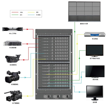 在這個(gè)項(xiàng)目中,與矩陣配合使用的設(shè)備有:松下高清攝像機(jī)(SDI),華為刀片服務(wù)器(VGA),標(biāo)清攝像機(jī)(C-video),Dell工作站(VGA),高清攝像機(jī)(VGA),華為高清視頻會(huì)議終端(SDI),視頻監(jiān)視器(C-video),索尼電視機(jī)(C-video),威創(chuàng)DLP大屏(DVI),松下103寸等離子電視(DVI)等。
