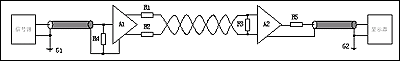 按照線路的形式,傳輸線可分為非平衡式和平衡式兩種。同軸電纜屬于非平衡傳輸線,雙絞線屬于平衡傳輸線。視頻設備,包括信號源及顯示設備,其接口通常是非平衡式,因此,可直接與同軸電纜匹配連接。要用雙絞線傳輸視頻信號,必需在發送端將非平衡信號轉換為平衡信號;以便驅動雙絞線,在接收端再將平衡信號轉換為非平衡信號,與顯示設備連接。一個基本的雙絞線視頻傳輸系統如圖1所示。圖中的A1是差分信號發送放大器,完成非平衡到平衡的轉換,A2是差分信號接收放大器,完成平衡到非平衡的轉換。