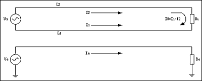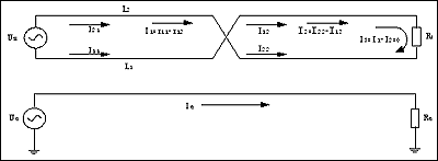 干擾信號對扭絞的雙線回路的干擾,見圖3。與圖2不同的是,雙線回路在中點位置進行了一次扭絞。在中點的兩邊,各自存在干擾電流I1和I2,I1=I11―I21,I2=I22―I12。由于兩段線路的條件完全相同,所以I1=I2。總干擾電流I3=I1―I2=0。通過分析,可以得出結論:只要合理地設置線路的扭絞,就能達到消除了干擾的目的。
