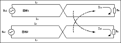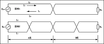 下面以回路1為主串回路,回路2為被串回路。我們將整個線路分為A、B兩段,先分析A段的串擾。在A段內,回路1未作扭絞,而回路2在二分之一處作扭絞。我們進一步來看回路1的導線L1對回路2的干擾的情況,不難發現,與2.1.2節討論的情況完全相同。根據2.1.2的分析可知,由于回路2在A段的中點扭絞,干擾電流為零。同樣道理,導線L2對回路2的干擾電流也為零。因此,在A段,回路1對回路的串擾電流為零。
