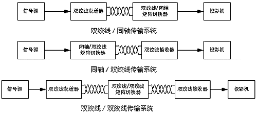 系統(tǒng)中配置一臺(tái)雙絞線/同軸矩陣切換器,矩陣的輸入為雙絞線,輸出為VGA或5BNC。所有的信號(hào)源均經(jīng)過(guò)發(fā)送器轉(zhuǎn)換為雙絞線,與矩陣連接。該系統(tǒng)要求矩陣切換器與投影機(jī)必須共地,矩陣切換器宜與投影機(jī)就近安裝。由于信號(hào)源與矩陣通過(guò)雙絞線連接,因此,信號(hào)源的地線不會(huì)對(duì)系統(tǒng)產(chǎn)生干擾。