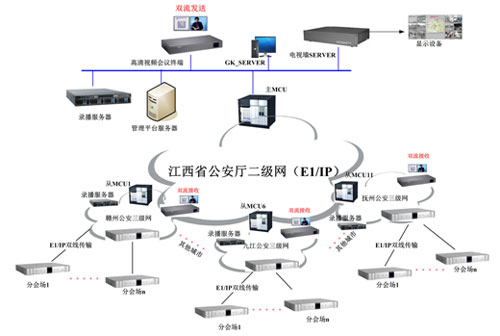 該系統在江西省公安廳網絡傳輸中心設置MCU一套,專線接入至省廳SDH傳輸網,同時提供以太網電接口,接入到省廳公安IP網,實現E1/IP雙網備份,任何一張網故障,均可實現自動倒換至另一張可用網絡。在江西省公安廳網絡傳輸中心配置迪威視訊的SIAP綜合圖像整合調度平臺系統。通過SIAP平臺系統通過對矩陣邊界協議控制網關能夠實現省廳到地市或省廳到縣任意兩級圖像任意圖像資源的調用,使系統使用、管理調度扁平化,為應急指揮調度提供很大的靈活性。