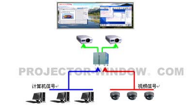 超大型交互式投影系統由兩片120寸NovaVista I系列強光正投光學屏幕橫向拼接組合而成。使用兩臺松下FD560 DLP投影機作正投吊頂固定安裝。再配置Accuon MV1000圖像處理器為投影機提供RGB電腦信號。