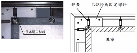 金屬框架轉角處固定裝置和密布的精密彈簧裝置從各角度調整幕面張力,能將由溫度、濕度引發的布料伸縮從各方位拉伸,確保幕布不受外力影響而產生波紋,平整性非常優越。