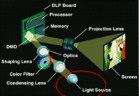2、 燈泡亮度系數利用不高:雙燈同時工作的原理是兩只燈泡同時點亮,兩束通過匯聚棱鏡匯聚后形成一束光再照射到DMD芯片上,由于匯聚棱鏡的光損失及其它光路的光損失,再加上DMD芯片狹小面積限制,雙燈同時工作的亮度不是“1+1”的疊加,而大約是雙燈理論總亮度的140%。當一個燈泡損壞或者只開一個燈泡使用的時候,亮度為正常輸出的70%。