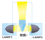 為使投影單元的薄弱環節—燈泡達到冗余備份,科視率先在控制室投影單元中采用了雙燈結構的背投模塊,其設計原理為在機器中采用了兩個UHP燈泡,兩個燈泡既可以同時工作,也可以單獨工作。其結構示意圖如下: