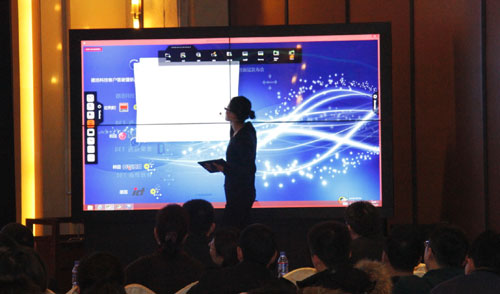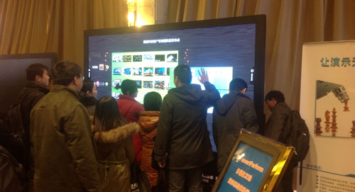 在會議室投影幕旁矗立著2×2觸摸拼接屏,演示著德浩的全球首款I(lǐng)CT SmartPerform多媒體互動演示系統(tǒng)。該系統(tǒng)融合美國好萊塢影像觸控技術(shù)和手勢驅(qū)動用戶界面,不僅支持鼠標(biāo)、鍵盤,同時也支持手勢控制或多點觸控,可將PowerPoint、PDF、圖片、視頻、網(wǎng)頁、Flash等不同格式文件在該界面中自由縮放、靈活操控,使用極為方便,吸引大量觀眾駐足、體驗。