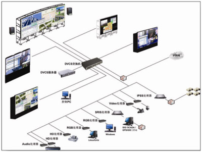 中達(dá)電通DVCS分布式圖像控制器系統(tǒng)是目前同類產(chǎn)品中功能最全面的,由RGB/DVI處理器、視頻處理器、高清處理器、音頻處理器、SRIS超高分處理器、IPSS流媒體處理器、顯示處理器、控制服務(wù)器、網(wǎng)絡(luò)交換機(jī)、控制管理軟件組成,幾乎涵蓋了大屏幕拼接顯示應(yīng)用涉及的所有信號(hào)源種類,不僅可以處理顯示常規(guī)計(jì)算機(jī)、復(fù)合視頻、高清視頻信號(hào),同時(shí)可以處理顯示超高分辨率動(dòng)態(tài)信號(hào)和IP流媒體視頻信號(hào)。系統(tǒng)應(yīng)用拓?fù)鋱D如下: