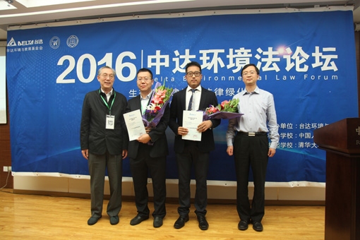 上海交通大學凱原法學院教授(左一)及最高人民法院環境資源審判庭副庭長魏文超(右一)為中國政法大學環境法研究所于文軒教授(左二)、重慶大學法學院杜輝副教授(右一)頒發“中達環境法青年學者獎