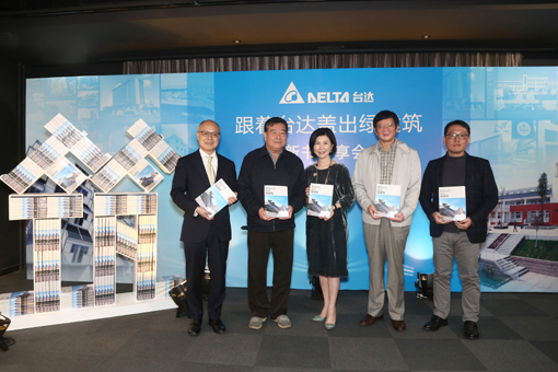 (中)、原中國可再生能源學會理事長石定寰(左二)、國家住宅工程中心副總建筑師曾雁(右二)、、美國綠色建筑委員會北亞區董事總經理杜日生(左一),《跟著臺達蓋出綠建筑》主筆高宜凡(右一)在新書發表會上人手一本《跟著臺達蓋出綠建筑》,期待與讀者分享臺達過去十年來在全球打造綠色建筑所累積的建造過程以及節能經驗完整呈現