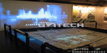 城市交通展廳是反映城市的交通狀況的,而城市的交通是隨時發生變化的,因此對于城市交通展示的內容也是需要實時發生變化的,相應地在展示手段上也必須符合城市的發展需要。上海巴士館采取了互動多媒體加大屏幕顯示的方式,這樣既提高了修改的效果,又增強了表現的效果,這為交通系統的展示提供了一個新的表現手段,也充分說明了偉景行的產品能夠以多種形式廣泛運用在展覽展示的行業中。此次的多通道運用主要是在一臺邊緣融合產品中同時接出3臺投影系統,其中2臺采用邊緣融合技術,在展位的正前方形成一個3米×7米的寬屏展示內容,在寬屏的正前方由一個地投系統把投影投在白色的路網上,這樣內容的修改只需要修改多媒體內容,形式靈活。