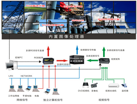 針對石油石化行業各種信號源分布范圍廣、傳輸距離遠等特點,威創為其配備了DigicomFLY系列多屏處理器。該系列處理器采用模塊化的設計,其先進的背板交換架構,能夠同時處理72路高清信號,并在72塊拼接屏上實時顯示?梢钥焖俑咝У貙⑺行盘栞斎氪笠幠底制唇哟笃溜@示系統,而其各輸入節點可近在咫尺,也可遠在千里之外,并可根據顯示需求隨時擴展,只要同在一個網絡中,即可完成輸入到輸出的傳輸顯示;輸出節點更可按不同地區、不同種類、不同性質隨意組合定義,方便監控人員查看所需信息。有了這套系統,查看、調用海量的動態監控視頻和靜圖像變得非常輕松。