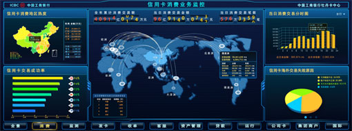 金融可視化解決方案依據對信用卡業務的理解,運用高分辨率數據可視化技術手段,實現了信用卡發卡業務、收單業務、消費業務、資產質量、風險監控、集團商戶、清算業務、境內外全景業務、客戶服務、公務卡業務、貸款業務、輿情資訊等全方面的監控。方案通過豐富靈活的圖表轉換,配置相應聲效、色彩、動態效果,進行大屏幕展現預警處置,可為各類機構、各層級經營和管理人員提供直觀、豐富、可干預的業務數據展示和監控平臺服務,從而達成“信用卡全業務流程”監控的目標。