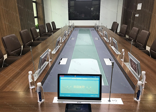 根據(jù)會議室布局及相關(guān)設(shè)計標準,萬邦醫(yī)藥無紙化系統(tǒng)中會議桌面采用嵌入式一體化雙顯升降終端,集成數(shù)字會議討論話筒升降一體。會議中一鍵手動、自動控制上升;會議后下降隱藏,不占桌面,整潔美觀。