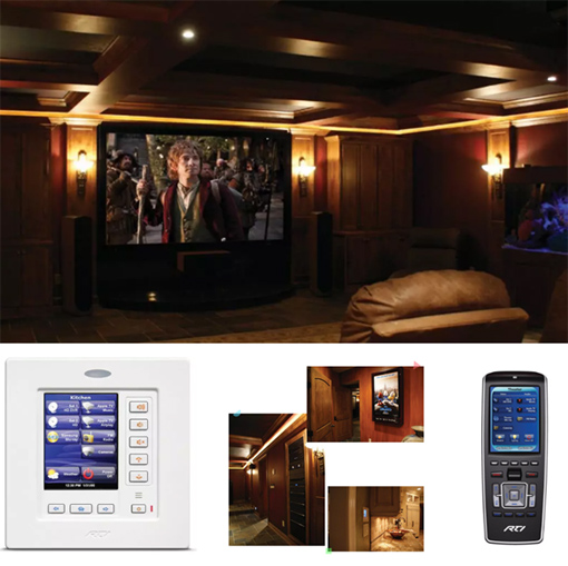 3.5英寸墻式觸摸屏來取代八個過時的面板,為客戶提供了更加友好、直觀的體驗。集成商結合家庭已有的RTI產品,在附屬和分離車庫中使用客戶原有的T2+手持式控制器,在劇院放映廳使用新的T3-V+遙控器。