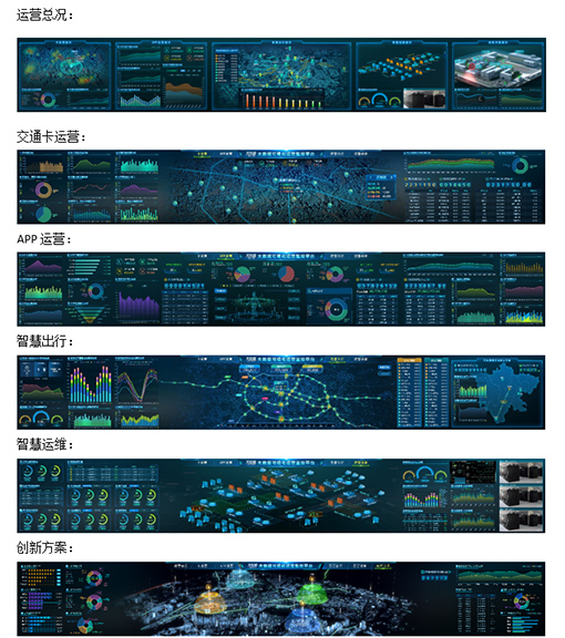 整個天府通大數據可視化運營監控平臺包括六大場景:運營總況、卡運營、APP運營、智慧出行、智慧運維、創新方案。