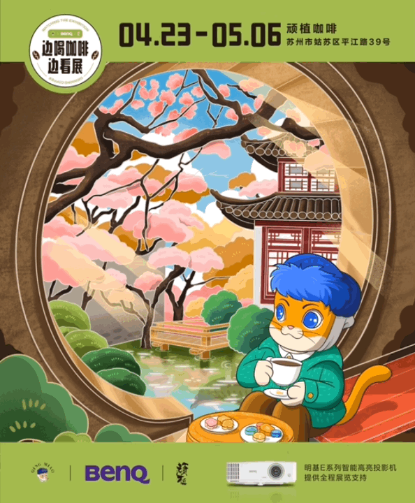 不少過往游客被店門口寫著“邊喝咖啡邊看展”的活動信息牌所吸引,而當他們走入店內,將會發現這里正在進行由明基E系列投影機聯合插畫藝術家清喵及頑植咖啡共同舉辦的《奇喵物語》微展覽。