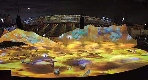 WU激光投影機以其40000流明的中心亮度參與對紗幕進行投射,使得場地中央出現了絲綢與地面的沙漠相連,駝隊、商人在“沙丘”上前行的精彩場景。