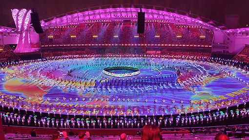 閉幕式的演出依然分為兩個篇章,上篇《我們相聚在一起》和下篇《美麗武漢歡迎你》。閉幕式演出的地面投影設備全部采用DP
