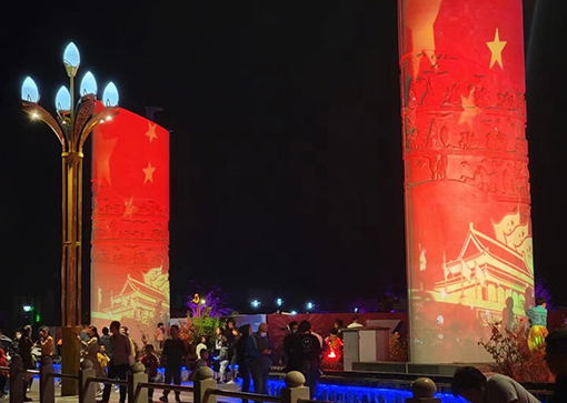 WU。在廣場中心的魔方雕塑上,和8根廣場立柱上,國慶主題為元素的投影內容循環演映,鮮紅的五星紅旗給島上增添了濃厚的節日氣氛,為祖國生日致以美好的祝福。