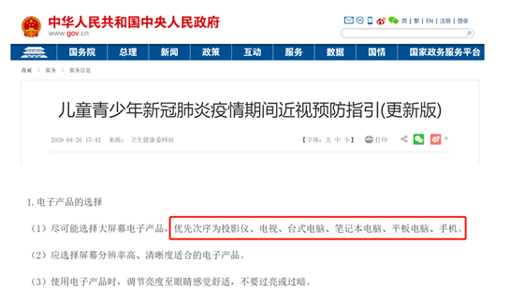 為預防近視,權威部門發布了《兒童青少年新冠肺炎疫情期間近視預防指引(更新版)》,指出在電子產品選擇方面,要盡可能選擇大屏幕電子產品,優先次序依次為投影機、電視、臺式電腦、筆記本電腦、平板電腦、手機。